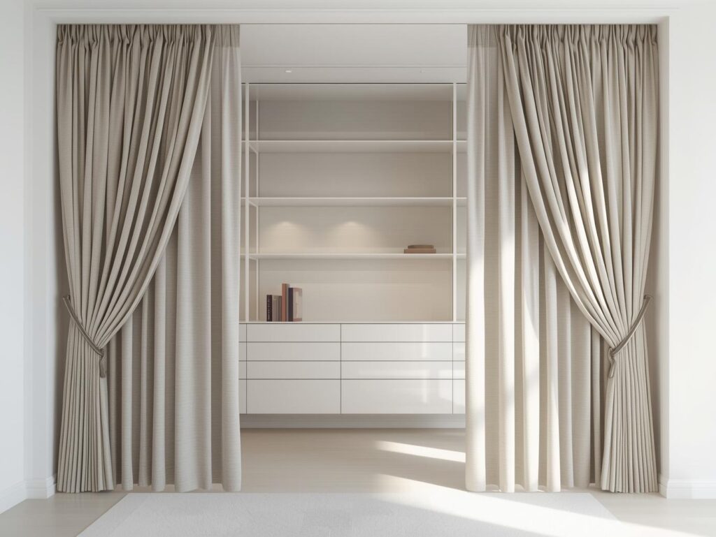 Curtains can hide open shelving or storage units, creating a clean and minimalist look. This approach works well in studios or open-plan flats.