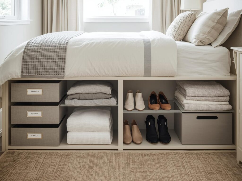 Use the space beneath the bed for storage boxes, drawers , or rolling bins. Ideal for storing off-season clothing, shoes, or extra linens without taking up closet space.