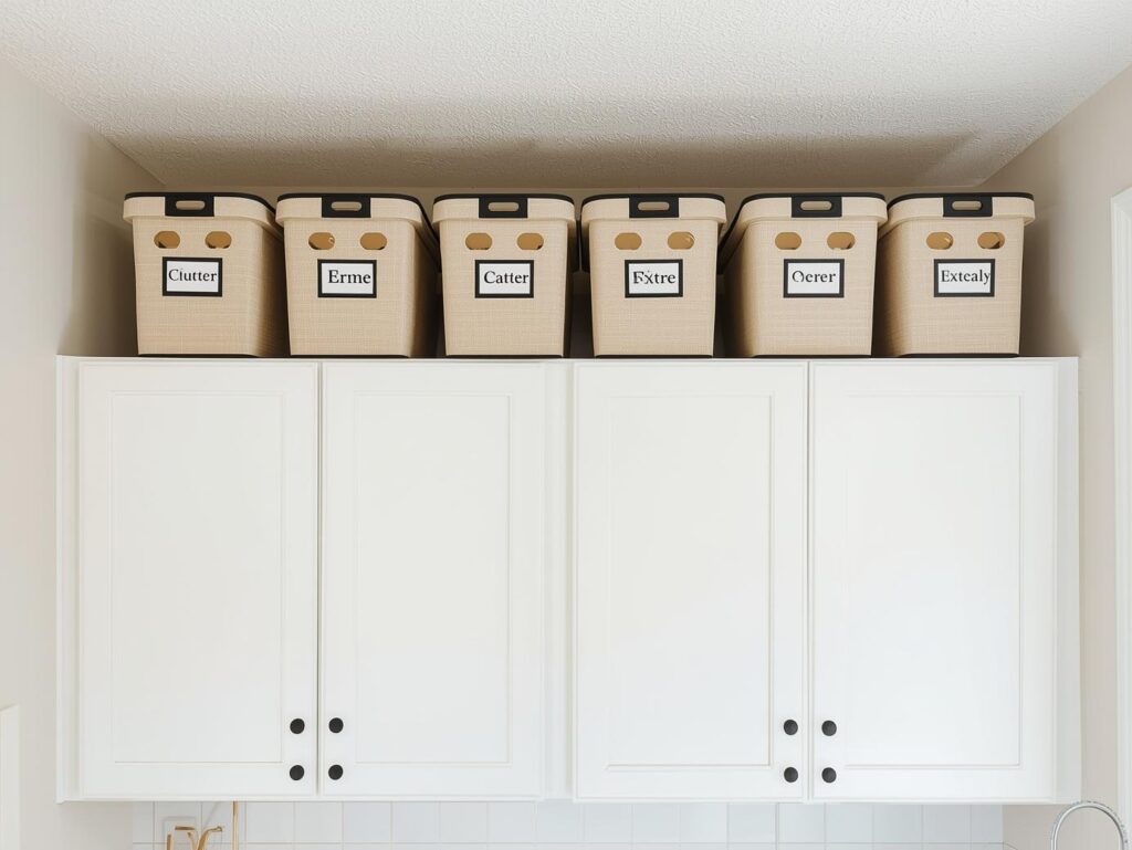 The area above kitchen cabinets or wardrobes can store rarely used items like holiday decorations or extra kitchenware. Use stackable boxes to keep everything organized.